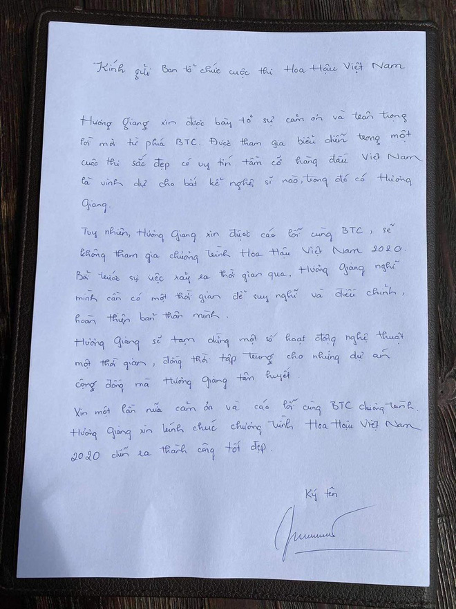 Tuy nhiên, Hương Giang xin được cáo lỗi cùng Ban tổ chức, sẽ không tham gia chương trình Hoa hậu Việt Nam 2020. Bởi trước sự việc xảy ra thời gian qua, Hương Giang nghĩ mình cần có một thời gian để suy nghĩ và điều chỉnh, hoàn thiện bản thân mình.