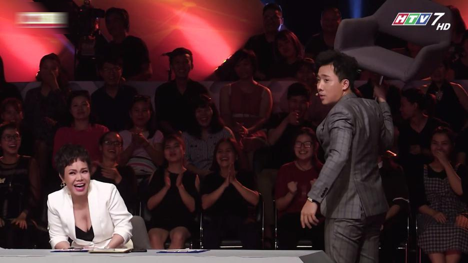 Nghe đàn em 'thả thính' bất chấp, Trấn Thành dọa ném ghế vào đàn em. Thế nhưng không cần Trấn Thành ra tay, Tuấn Trần đã nhận cái kết cay xé lưỡi khi cố nhai một miếng ớt to vì tin lời Trường Giang rằng ớt này không cay.
