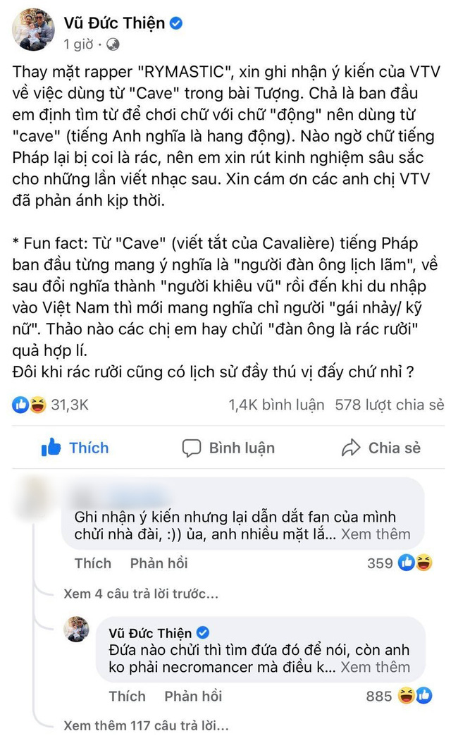 Sau đó, Rhymastic còn giải thích thêm: "Từ cave (viết tắt của Cavalière) tiếng Pháp ban đầu từng mang ý nghĩa là người đàn ông lịch lãm, về sau đổi nghĩa thành người khiêu vũ rồi đến khi du nhập vào Việt Nam thì mới mang nghĩa chỉ người gái nhảy/kỹ nữ. Thảo nào các chị em hay chửi đàn ông là rác rưởi quả hợp lí. Đôi khi rác rưởi cũng có lịch sử đầy thú vị đấy chứ nhỉ".