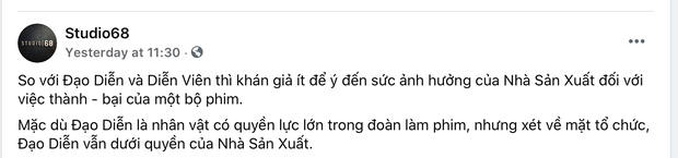 Trước bài đăng của vị đạo diễn này không lâu, fanpage chính thức của công ty sản xuất phim do Ngô Thanh Vân sáng lập, cũng có một dòng trang thái. Có điều, nội dung dòng trạng thái thể hiện quan điểm khác so với đạo diễn Phan Gia Nhật Linh. Phía Studio68 dường như đang khẳng định quyền hành trong một ekip làm phim của nhà sản xuất cũng như kể lể rằng nhã sản xuất thường ít được khán giả chú ý hơn đạo diễn.