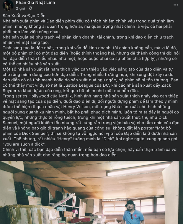 Đạo diễn Phan Gia Nhật Linh - được biết là đã tham gia thực hiện phim điện ảnh Trạng Tí với vai trò người chịu trách nhiệm chính về nội dung - cách đây không lâu đã đăng tải một bài dài khá dài trên trang cá nhân của mình. Chủ đề xoay quanh vai trò của phía Sản xuất và Đạo diễn trong quá trình làm ra một tác phẩm phim ảnh. Cụ thể, anh viết: "Một số nhà sản xuất rất ham thích việc can thiệp vào việc sáng tạo của đạo diễn và tự cho rằng mình đứng cao hơn đạo diễn", đi kèm theo quan điểm của anh là một số ví dụ minh họa từ nền điện ảnh Hollywood.