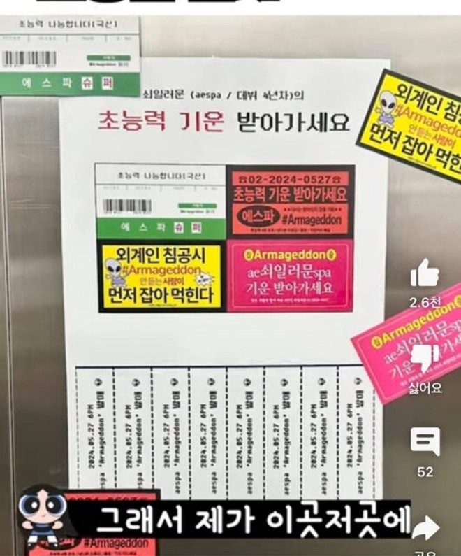 Để giải thích rõ hơn về "chiêu trò" này, có thể tóm tắt lại sự tình như sau. Nhiều tháng trước, CEO Min Hee Jin của ADOR và HYPE có mối quan hệ căng thẳng. Thời điểm đó, chủ tịch Bang Si Hyuk của HYPE lộ tin nhắn hỏi liệu Min Hee Jin có để "đè bẹp" aespa hay không. Vì không muốn dính vào trận chiến của các nhà lãnh đạo 2 bên, Karina (aespa) đã bàn với Minji (NewJeans) 1 kế hoạch bí mật như chiêu đáp trả dư luận, chứng minh mối quan hệ tốt đẹp của 2 nhóm. Theo kế hoạch, Minji đã dán sticker để giúp aespa quảng bá đợt comeback với ca khúc Armageddon tại chính toà nhà trụ sở chính của HYPE.