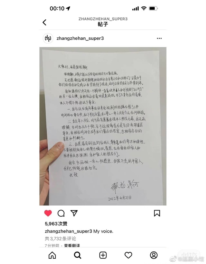 Cụ thể ở đầu bức thư tay đăng trên Instagram, Trương Triết Hạn đã gửi lời cảm ơn đến những người bạn luôn tin tưởng mình trong cơn sóng gió. Vốn đang ở đỉnh cao sự nghiệp, đáng tiếc giờ Trương Triết Hạn lại bị phong sát toàn diện, thậm chí các tài khoản mạng xã hội như Weibo cũng không được phép sử dụng nữa.