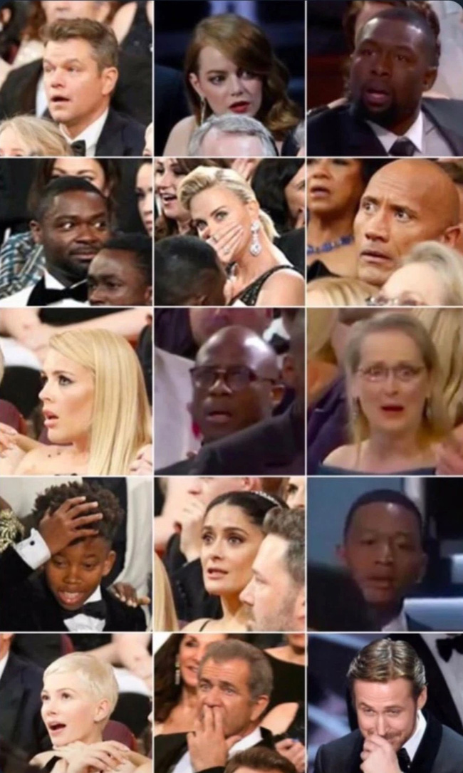 Không những vậy, cộng đồng mạng còn chế hình ảnh với biểu cảm "sốc toàn tập" của dàn sao Hollywood để chia sẻ về "biến lớn" giữa Will Smith và Chris Rock tại Oscar năm nay.