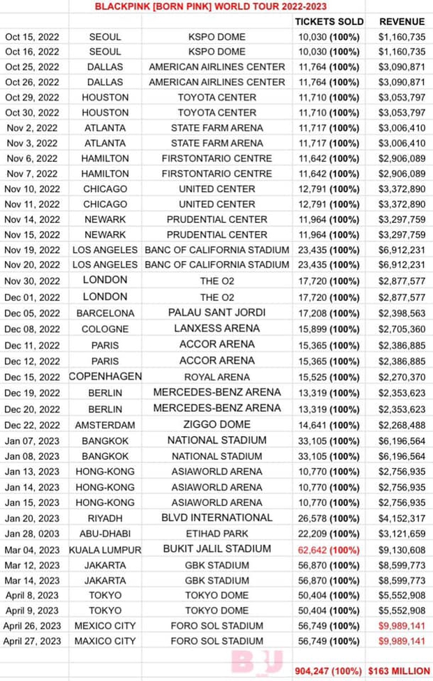 Bên cạnh đó, từ tháng 10/2022 cho đến nay, BLACKPINK cũng đã bán được khoảng 904.247 vé trên toàn thế giới cùng doanh thu lên đến 163,8 triệu USD (khoảng 3.853 tỷ đồng).