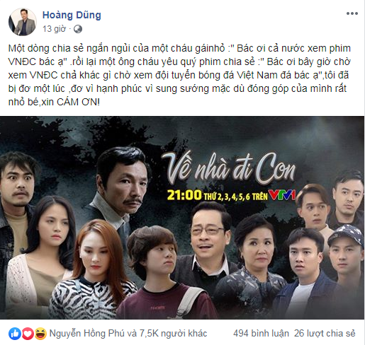 NSƯT Hoàng Dũng viết: "Một dòng chia sẻ ngắn ngủi của một cháu gái nhỏ: "Bác ơi cả nước xem phim Về Nhà Đi Con bác ạ", rồi lại một ông cháu yêu quý phim chia sẻ : "Bác ơi bây giờ chờ xem Về Nhà Đi Con chả khác gì chờ xem đội tuyển bóng đá Việt Nam đá bác ạ". Tôi đã bị đơ một lúc, đơ vì hạnh phúc vì sung sướng mặc dù đóng góp của mình rất nhỏ bé. Xin cảm ơn!".