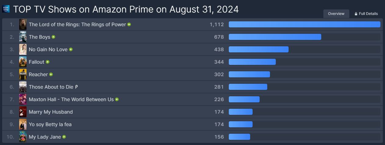 Theo số liệu từ Flix Patrol, mùa hai của The Lord of the Rings: The Rings of Power (Chúa Tể Những Chiếc Nhẫn: Những Chiếc Nhẫn Quyền Năng) đang là bộ phim có lượt xem cao nhất trên toàn thế giới trên Amazone Prime, thống trị 107 quốc gia. Loạt phim được giới phê bình khen ngợi hết lời, ví như Game of Thrones phiên bản thần thoại và đen tối hơn cả mùa trước.
