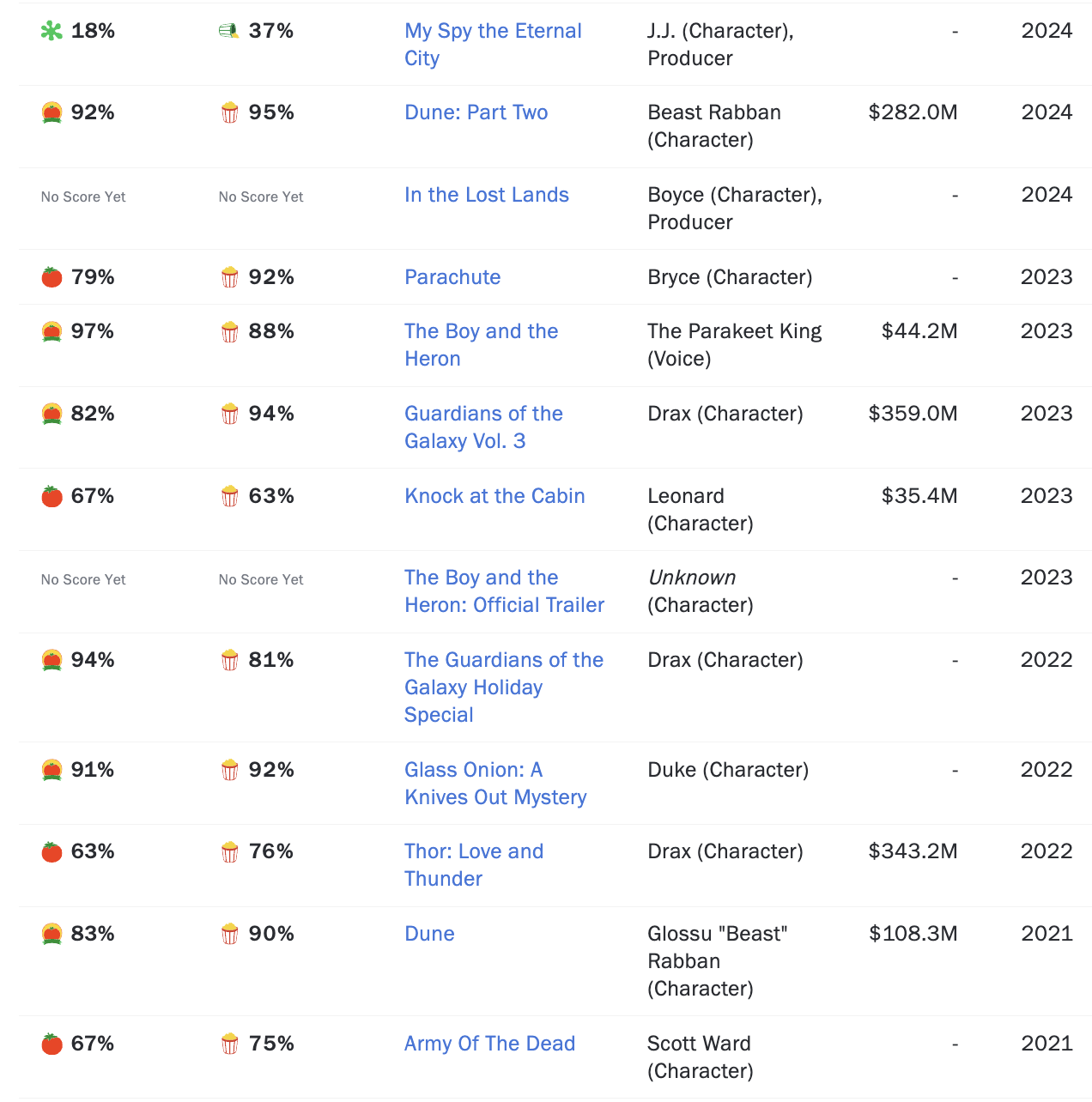 Thành tích này cũng chấm dứt chuỗi 10 phim liên tiếp được xếp loại "cà chua tươi" trong 4 năm qua của Dave Bautista. Đô vật nổi tiếng một thời này lấn sân diễn xuất với hàng loạt vai phụ trong các bom tấn hành động như House of the Rising Sun, The Man with the Iron Firsts, hay Riddick. Sau đó, anh gây tiếng vang nhờ đóng nhân vật Drax the Destroyer trong Vũ trụ Điện ảnh Marvel. Vai diễn này cũng thành bước đệm giúp Dave Bautista được mời vào hàng loạt bom tấn đình đám như Spectre hay Blade Runner 2049 sau đó.
