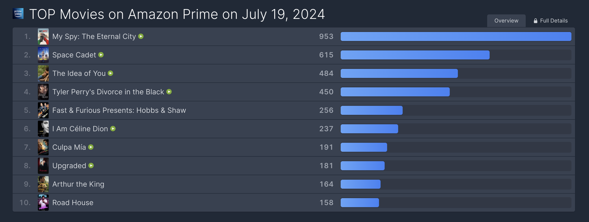 My Spy: The Eternal City là phần 2 của thương hiệu hài - hành động do cựu đô vật Dave Bautista đóng chính. Kịch bản tiếp tục theo chân điệp viên đặc vụ cơ bắp JJ và cô bé nghịch ngợm Sophie. Lần này, họ cùng nhau tới Italy nhân dịp một chuyến tham quan của trường và vô tình vướng vào một vụ khủng bố quốc tế. Ngay sau khi lên sóng, bộ phim đã vươn lên vị trí top 1 lượt xem trên nền tảng phim trực tuyến Amazon Prime. My Spy: The Eternal City đứng đầu tại 68 quốc gia và vùng lãnh thổ, vượt qua bộ phim ngôn tình, hài Space Cadet của Emma Roberts.