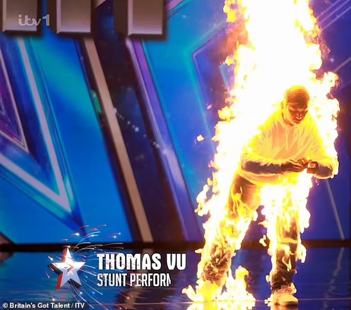 Theo đó, trong đêm thi vòng loại Britain's Got Talent tối Chủ nhật (16/4), người xem thót tim trước tiết mục của Thomas Vu - một diễn viên đóng thế 35 tuổi. Thomas bôi lớp gel chống cháy lên cơ thể và nhờ nhân viên trường quay phun lửa vào người.