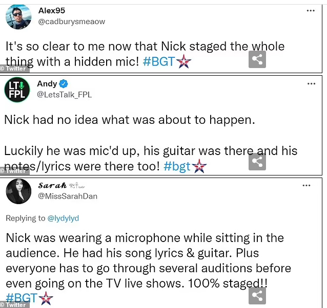 Khán giả khác đồng tình: "Nick đeo microphone khi ngồi dưới hàng ghế khán giả. Anh ấy có sẵn bài hát và guitar. Đoán chắc là anh ta đã qua vài cuộc thử giọng trước khi lên trình diễn trực tiếp ở sân khấu. 100% là dàn dựng rồi". Tuy nhiên Britain's Got Talent khẳng định Nick là khán giả đã được chương trình chọn trước đó với tư cách là một phần của chiếc hộp bật mí nên anh được cài sẵn mic trên áo nhằm ghi lại phản ứng trực tiếp của khán giả bên dưới.
