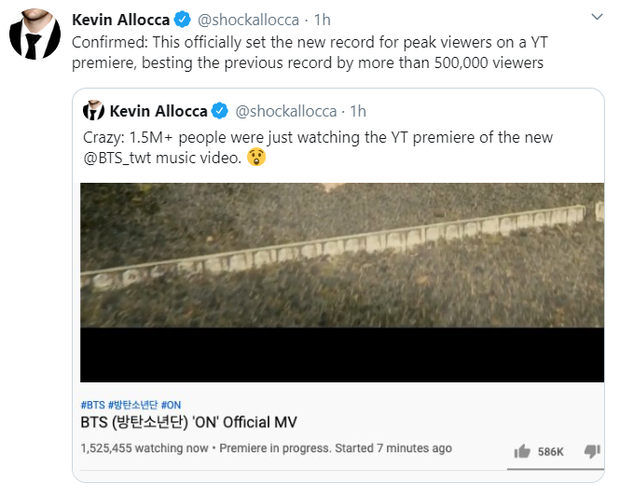 Đáng chú ý, BTS áp dụng hình thức công chiếu trực tiếp (premiere) trên Youtube với MV lần này. Ngay lập tức, MV "ON" đã đạt hơn 1,5 triệu lượt xem trực tuyến, phá vỡ kỉ lục công chiếu của thế giới BLACKPINK lập trước đó với MV "Kill This Love" (979,000 lượt). Con số này đã được xác nhận bởi Kevin Allocca - trưởng bộ phận Văn hóa và Xu hướng của Youtube.