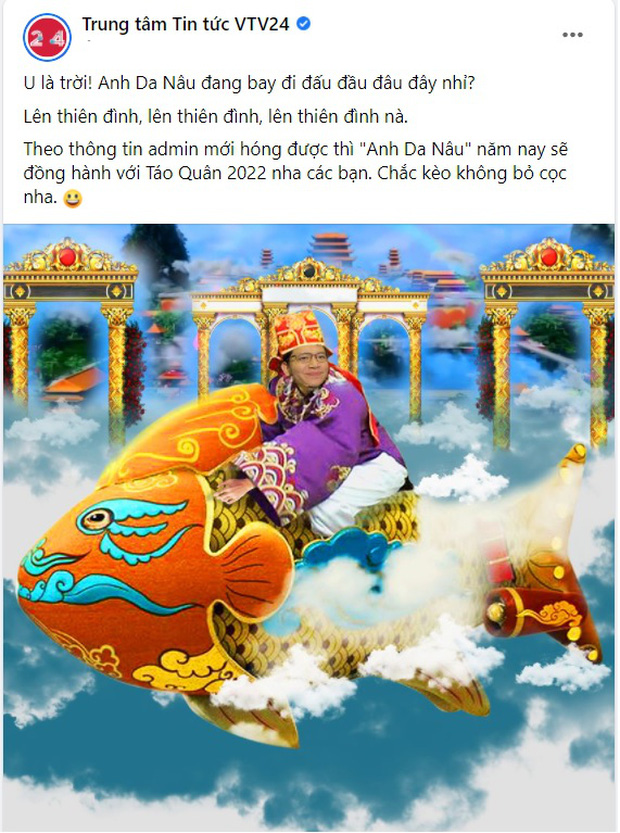 Mới đây, Fanpage Trung tâm Tin tức VTV24 gây chú ý khi đăng tải thông tin liên quan đến chương trình Táo quân 2022: "Anh Da Nâu đang bay đi đấu đầu đâu đây nhỉ? Lên thiên đình, lên thiên đình, lên thiên đình nà. Theo thông tin admin mới hóng được thì "Anh da nâu" năm nay sẽ đồng hành với Táo quân 2022 nha các bạn. Chắc kèo không bỏ cọc nha".