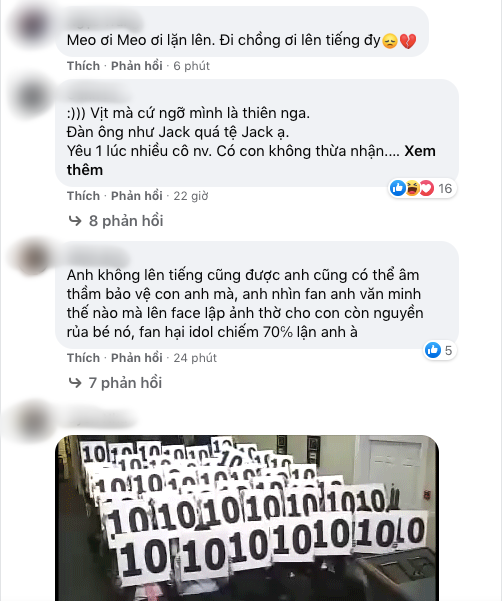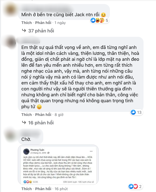 Chưa dừng lại ở đó, netizen còn tràn vào Fanpage và Facebook cá nhân của Jack để ném đá nam ca sĩ. Trên bức ảnh Jack khoe nhận được đồng phục mới từ Running Man Vietnam, netizen liên tục để lại bình luận tiêu cực. Nhiều người cho rằng Jack nên lên tiếng nói rõ sự việc, có đúng hay có sai gì thì cũng phải cho khán giả một lời giải thích.