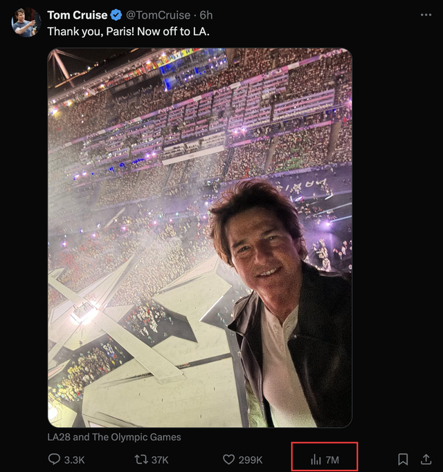 Và bức hình selfie Tom Cruise đăng lên Twitter ngay sau màn trình diễn kinh điển này đã làm MXH nổ tung, cán mốc ấn tượng 7 triệu view và thu hút gần 300 nghìn lượt like, hàng nghìn lượt bình luận. Sở dĩ bức hình này hot đến vậy vừa là vì nó ghi lại khoảnh khắc kinh điển Olympic Paris "bàn giao" quyền đăng cai Thế vận hội Mùa Hè cho Olympic Los Angeles 2028, vừa giúp Tom "flex" đẳng cấp siêu sao phim hành động nổi tiếng, và cuối cùng là độ tuổi của nam tài tử khi thực hiện màn đu dây mạo hiểm này - 62 tuổi. Đông đảo netizen toàn cầu hiện đang sốc nặng khi biết được tuổi của Tom Cruise, nể phục khả năng khó tin của nam tài tử ở độ tuổi mà người bình thường có lẽ còn đang làm ông còng lưng bế cháu ở nhà.