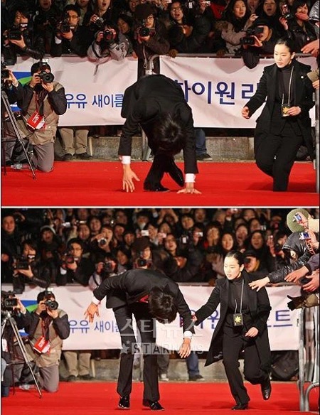 Cụ thể, vào đêm diễn ra lễ trao giải, Lee Min Ho là một trong những mỹ nam có mặt sớm nhất. Có lẽ vì lần đầu được sải bước trên thảm đỏ lớn, Lee Min Ho đã không giấu được sự hồi hộp đến nỗi không chú ý xung quanh, kết quả là nam diễn viên “vồ ếch” trước ống kính truyền thông.