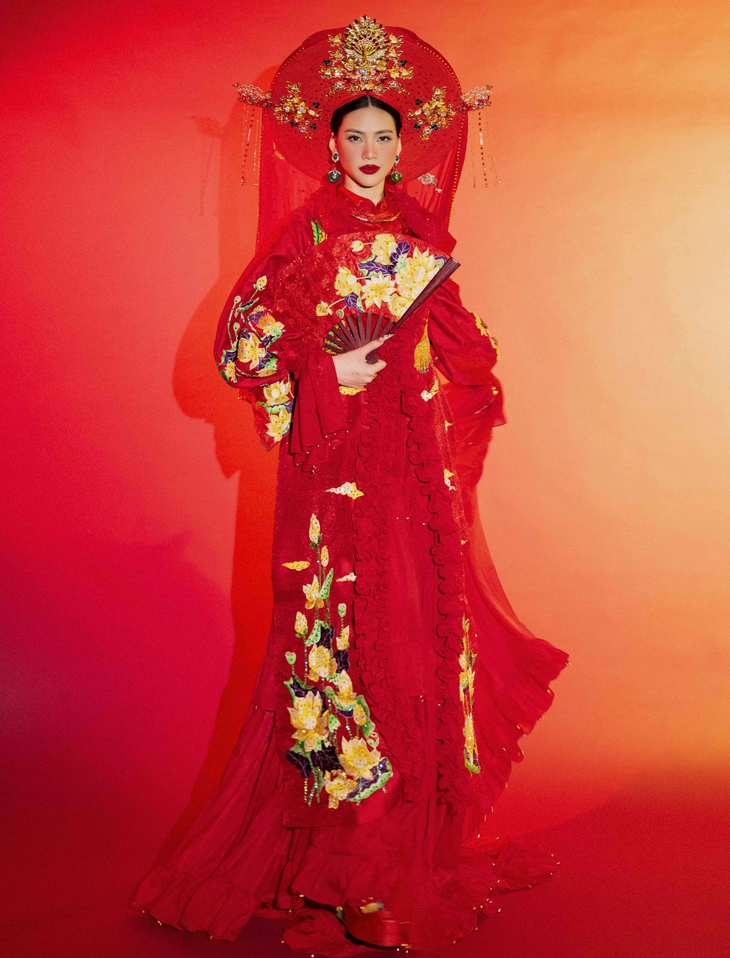 Phom dáng bộ trang phục được lấy cảm hứng từ áo tứ thân. Điểm nhấn là các họa tiết thêu hình đôi chim phụng, hoa sen.