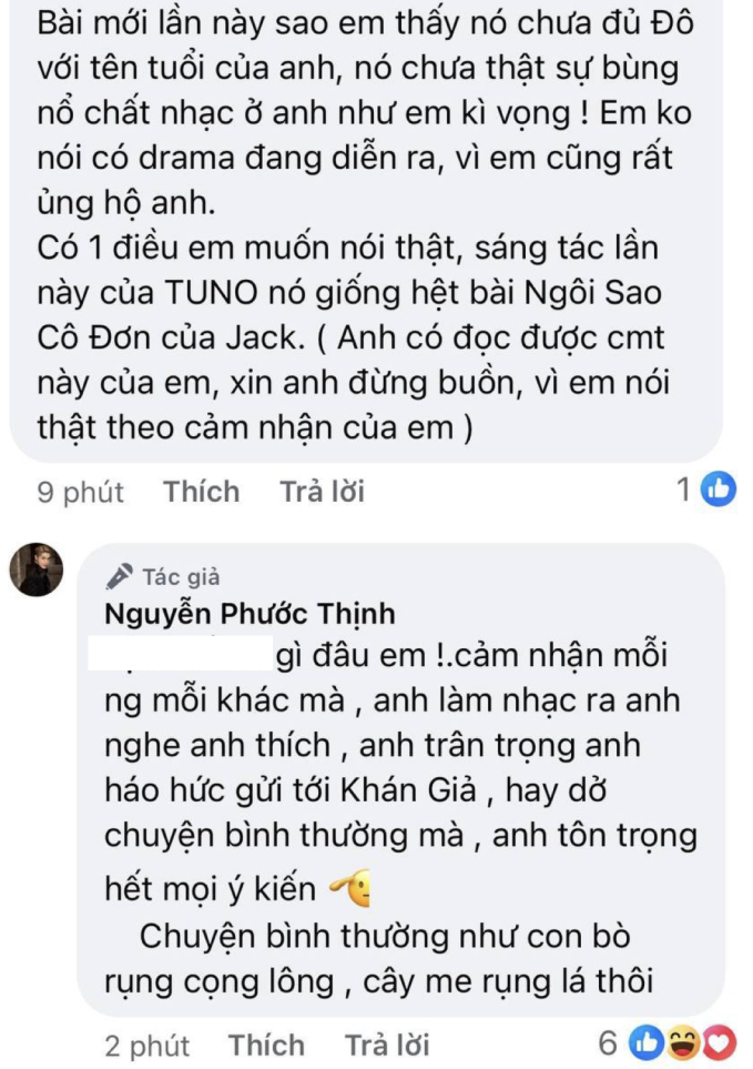 Góp ý nhẹ nhàng, văn minh từ vị khán giả cũng được Noo Phước Thịnh trả lời khá thẳng thắn: "Cảm nhận mỗi người mỗi khác mà, anh làm ra nhạc anh nghe anh thích, anh trân trọng anh háo hức gửi đến khán giả, hay dở chuyện bình thường mà, anh tôn trọng hết mọi ý kiến. Chuyện bình thường như con bò rụng cọng lông, cây me rụng lá".