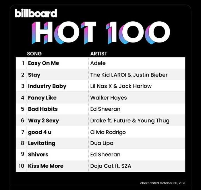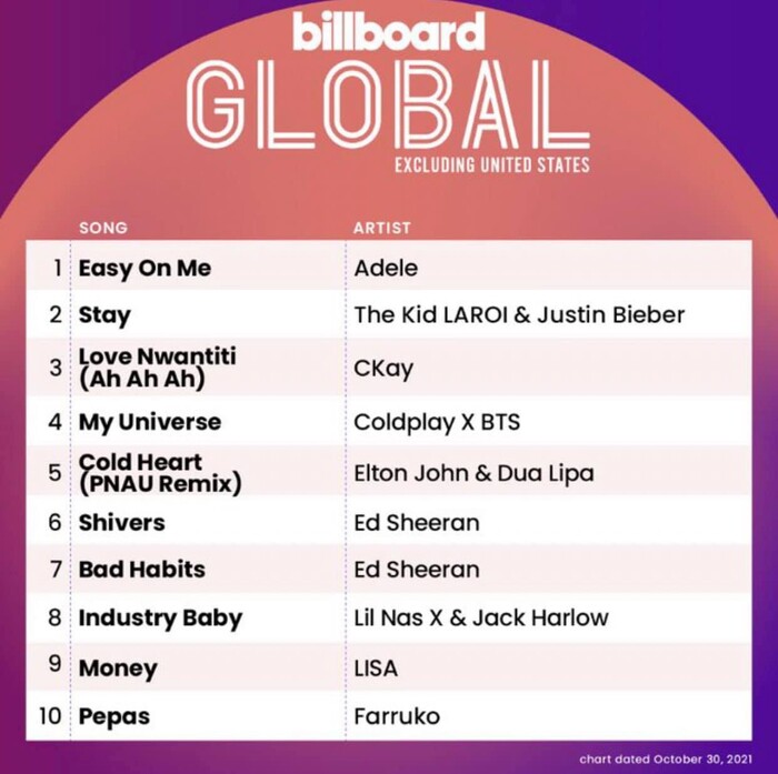Không chỉ vậy, nữ ca sĩ cũng chiếm luôn hạng 1 trên BXH Billboard Global 200 và BXH Global Excl US. Điều này phần nào chứng minh được sự thành công của Easy On Me tại thị trường Mỹ.