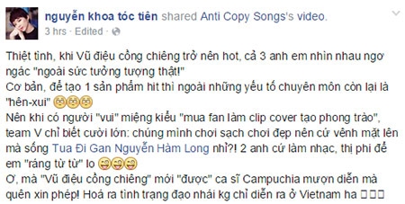 Nói về vũ đạo gây sốt nơi khán giả trẻ, nữ ca sĩ chia sẻ bức xúc về việc nhiều người cho rằng cô mua fan để tạo phong trào. Tóc Tiên viết: "Thiệt tình, khi vũ điệu cồng chiêng trở nên hot, cả 3 anh em nhìn nhau ngơ ngác: 'Ngoài sức tưởng tượng thật!'. Cơ bản, để tạo 1 sản phẩm hit, ngoài những yếu tố chuyên môn còn lại là hên - xui. Nên khi có người vui miệng kiểu 'mua fan làm clip cover tạo phong trào', team V chỉ biết cười lớn. Chúng mình chơi sạch chơi đẹp, nên cứ vênh mặt lên mà sống".
