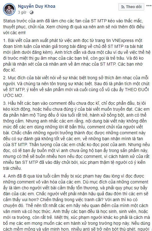 Nam ca sĩ cho rằng rất nhiều fan của Sơn Tùng chưa hiểu hết nội dung bài viết của anh nhưng đã bị lôi kéo kích động dẫn đến những việc làm đáng tiếc như vậy.