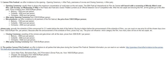 Các công ty trung gian như GrandazuR Company, The Sincura Group đăng tải giá vé rõ ràng trên website. Giá vé gồm nhiều mức độ, cao nhất có thể bao trọn gói từ vé máy bay, khách sạn, vị trí chỗ ngồi đến chi phí tham gia các sự kiện thuộc khuôn khổ LHP. Càng là những show có nhiều ngôi sao nổi tiếng tham gia, vé để tham dự càng đắt đỏ.