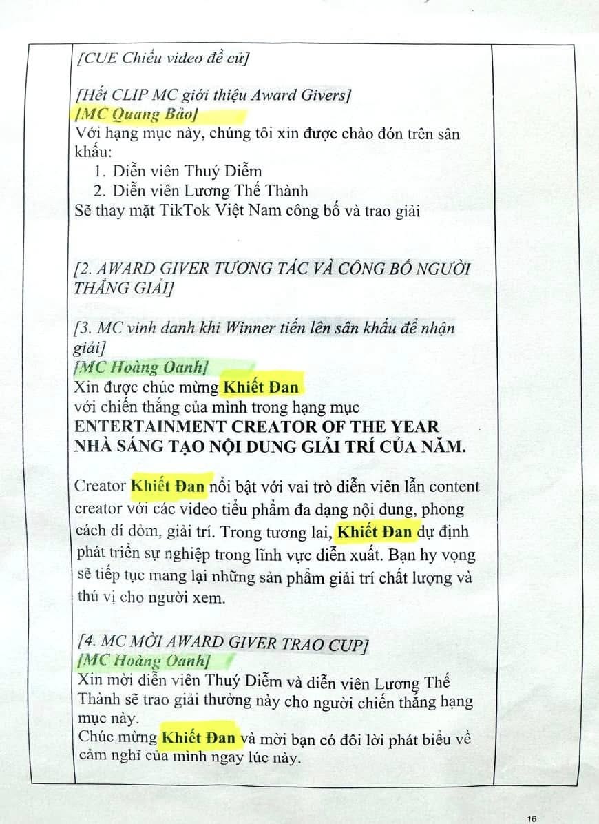 Khuya 25/11, công ty quản lý của MC Hoàng Oanh có bài đăng dài, với tiêu đề “Phản hồi về tình huống của MC Hoàng Oanh tại lễ vinh danh TikTok Award Vietnam 2024”. Kèm theo đó, phía công ty của nữ MC đã đăng công khai hình ảnh kịch bản dẫn dắt phần trao giải làm bằng chứng khẳng định Hoàng Oanh không sai.