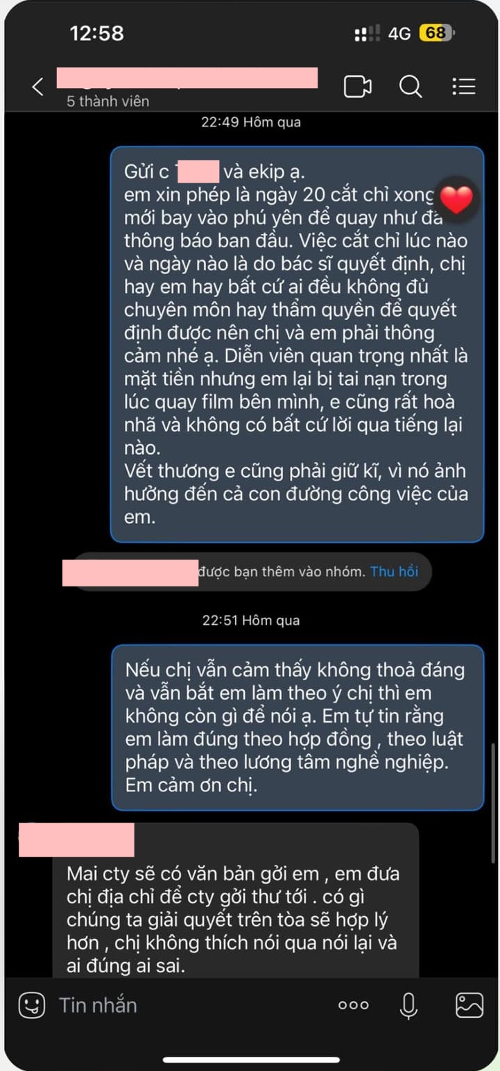 Khi xảy ra tranh cãi, nữ diễn viên gửi tin nhắn trình bày lý do với ekip làm phim: "Việc cắt chỉ lúc nào là do bác sĩ quyết định, chị hay em hay bất kỳ ai đều không đủ chuyên môn hay thẩm quyền quyết định được nên em mong được thông cảm. Diễn viên quan trọng nhất là mặt tiền nhưng em lại bị tai nạn trong lúc quay phim bên mình, em cũng rất hoà nhã, không có bất kỳ lời qua tiếng lại nào. Vết thương em cũng phải giữ kỹ vì nó ảnh hưởng đến cả con đường sự nghiệp của em. Nếu chị thấy không thoả đáng, muốn em làm theo ý chị thì em không có gì để nói. Em tự tin rằng em làm đúng theo hợp đồng, theo luật pháp và theo lương tâm nghề nghiệp".