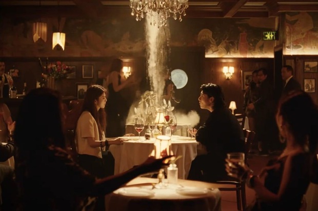 Trong đoạn video dài 20 giây, giọng ca của BTS đang ăn tối cùng nữ diễn viên Han So Hee tại nhà hàng sang trọng. Cả hai bắt đầu tranh cãi và khi mọi chuyện trở nên gay gắt hơn, chiếc đèn chùm rơi xuống khiến những vị khách khác hoảng sợ.