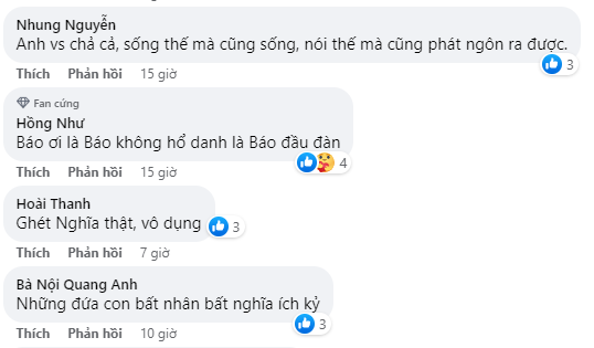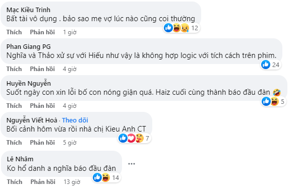 "Con trai cả sao hèn hạ quá vậy. Muốn bố bán nhà ở quê mà không dám thuyết phục nhà vợ bán nhà", "Cả anh Nghĩa và chị Thảo đều không tốt. Nhất là ông anh cả ích kỷ, hèn hạ, bất hiếu", "Xây dựng nhân vật Nghĩa lố quá. Là con cả chưa giúp gì cho bố, giờ lại đòi bán nhà bố để trả nợ cho mình. Lại còn vì tranh giành với các em nên nói Hiếu là con hoang"... là những bình luận của khán giả về phân cảnh này.