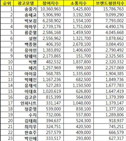 Bảng xếp hạng do Cục phân tích Thương hiệu Hàn Quốc tổ chức và thực hiện hàng tháng để tôn vinh những ngôi sao có tầm ảnh hưởng mạnh mẽ trong lĩnh vực quảng cáo, thúc đẩy mặt hàng trong nước. Mới đây, danh sách ngôi sao tháng 3 theo hạng mục quảng cáo đã được công bố. Trong đó, kết quả cuối cùng được phân tích dựa trên 2 tiêu chí: Chỉ số tham gia quảng bá, chỉ số truyền thông.