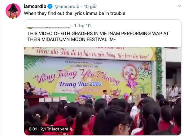 Vì vậy, mới đây Cardi B hoảng hốt đăng tải cập nhật mới trên tài khoản Twitter cá nhân khi xem được một đoạn video các em học sinh ở Việt Nam hào hứng nhảy theo giai điệu của WAP trong một chương trình mừng lễ Trung Thu. Trong phần chia sẻ, Cardi B viết: "Khi mà họ tìm ra được ý nghĩa của lời bài hát thì tôi gặp rắc rối to rồi!".