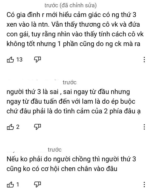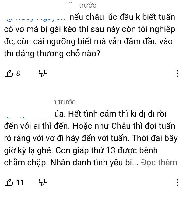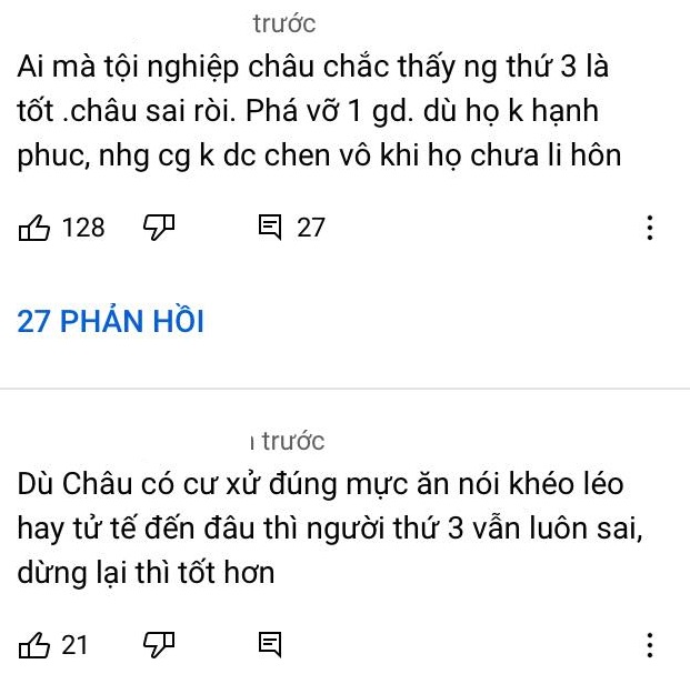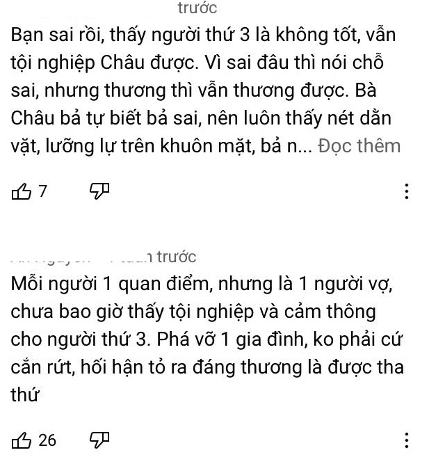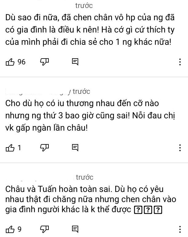 Nhiều khán giả cho rằng Châu chia tay Tuấn vì không muốn anh đau lòng, khó xử thêm chứ không phải vì cảm thấy có lỗi với Lam (vợ Tuấn) hay nhận ra mình sai. Trong phim, chỉ có Lam ghét Châu còn lại các nhân vật khác đều đứng về phía Châu, đồng cảm với nỗi đau của cô khiến khán giả cho rằng phim cổ xúy 'tiểu tam', biến kẻ thứ 3 thành người đáng thương.