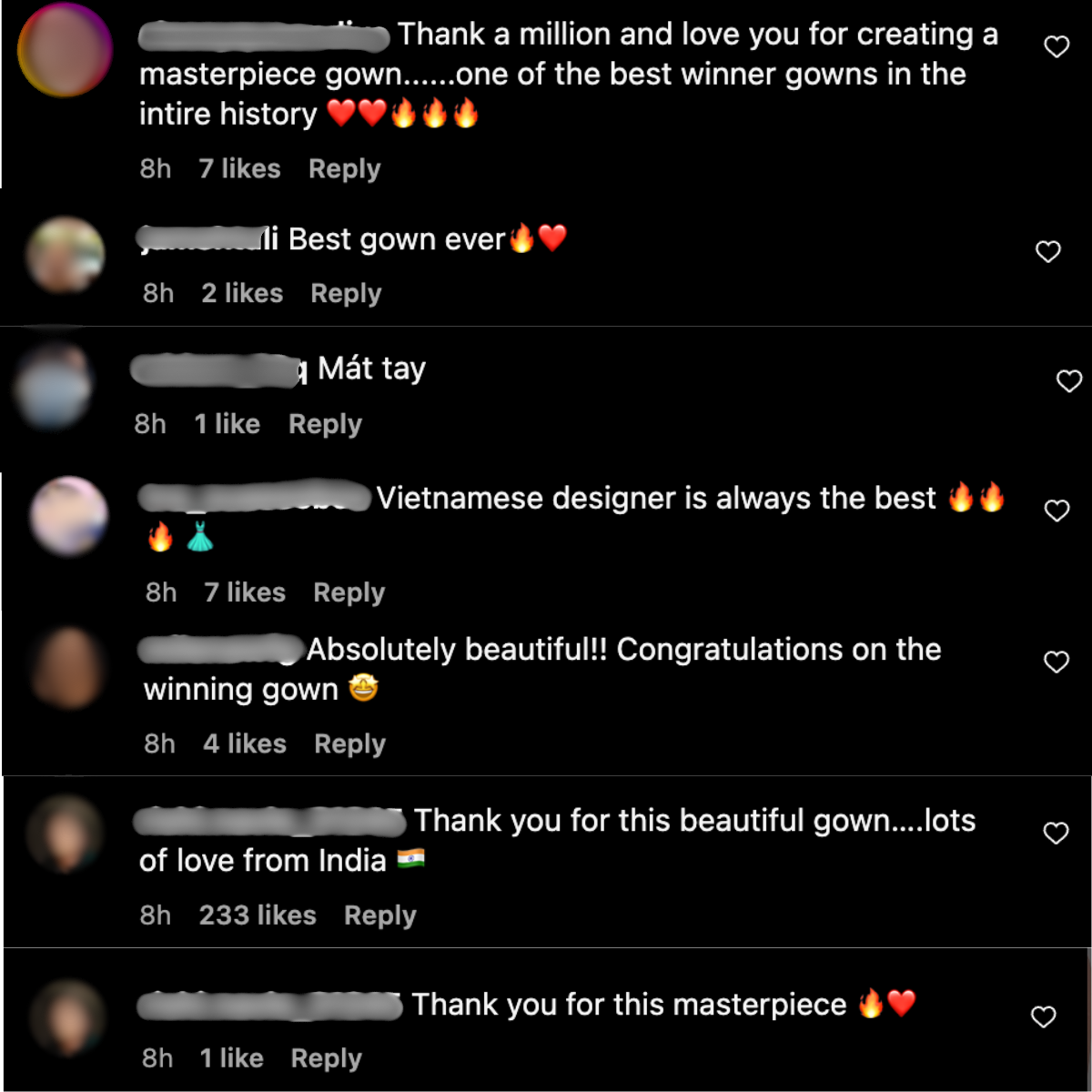 "Cảm ơn anh vì đã tạo nên bộ váy dạ hội siêu phẩm, 1 trong những chiếc váy đỉnh nhất trong lịch sử Hoa Hậu", "Váy dạ hội đỉnh nhất từ trước tới nay", "Thiết kế của người Việt luôn là nhất"...