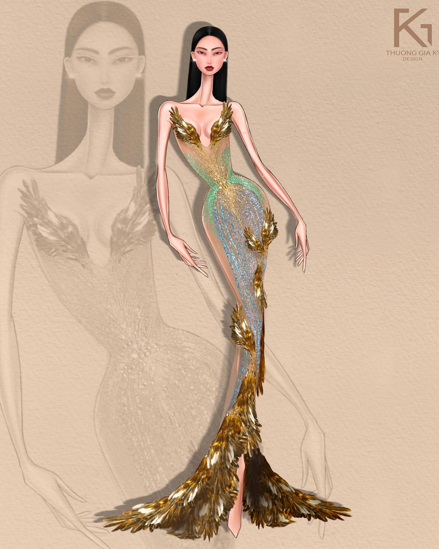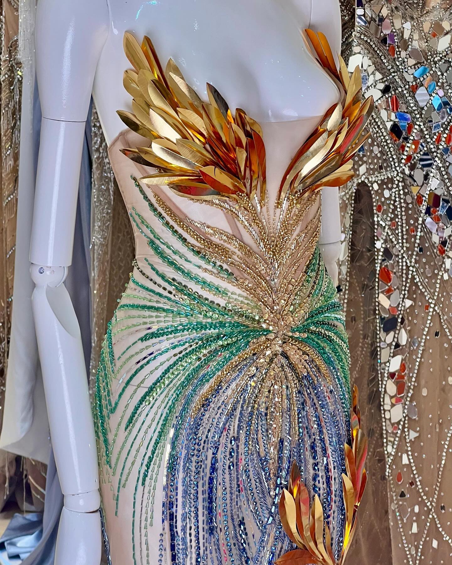 Người đẹp Ấn Độ toả sáng rực rỡ trong mẫu váy có tên "The Mystic Feather", đây được giới thiệu là một thiết kế pha trộn tuyệt vời giữa di sản văn hoá với sự sang trọng hiện đại, thể hiện nét quyến rũ vượt thời gian và tinh thần sôi động của nước Ấn. Chiếc váy có các chi tiết màu vàng lấp lánh lấy cảm hứng từ Garuda - loài chim thần thoại Ấn Độ, được nhấn bằng màu xanh lam và xanh lục tạo nên hình tượng chim công.
