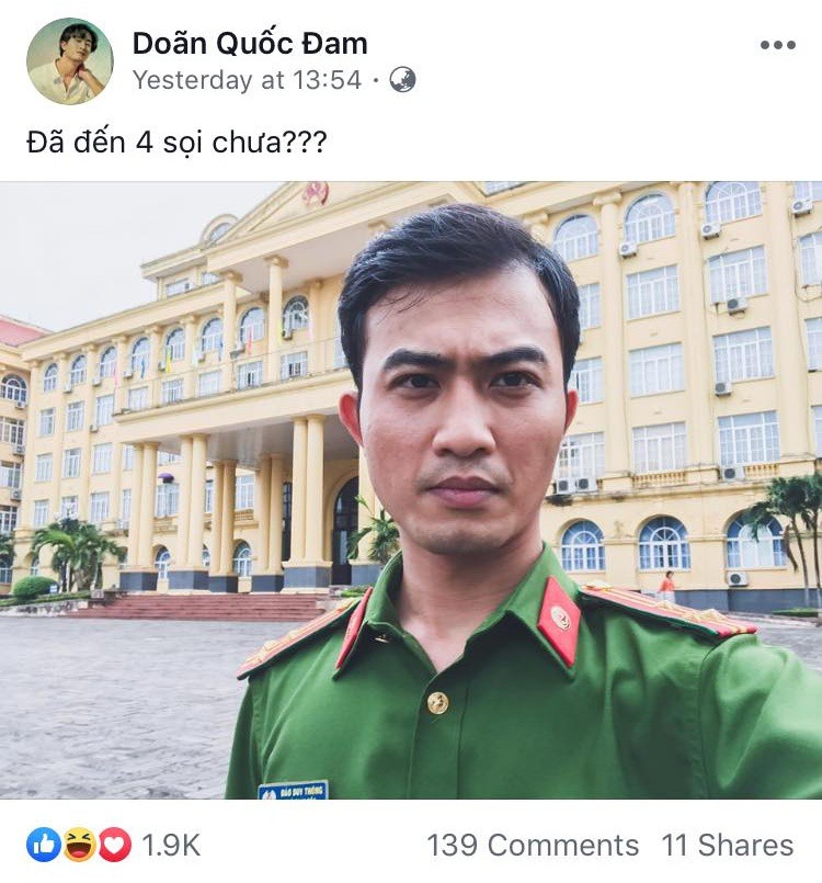 Trong ảnh, Doãn Quốc Đam đang mặc một bộ đồng phục cảnh sát và đứng trước một tòa nhà có treo biểu tượng của lực lượng vũ trang Việt Nam.
