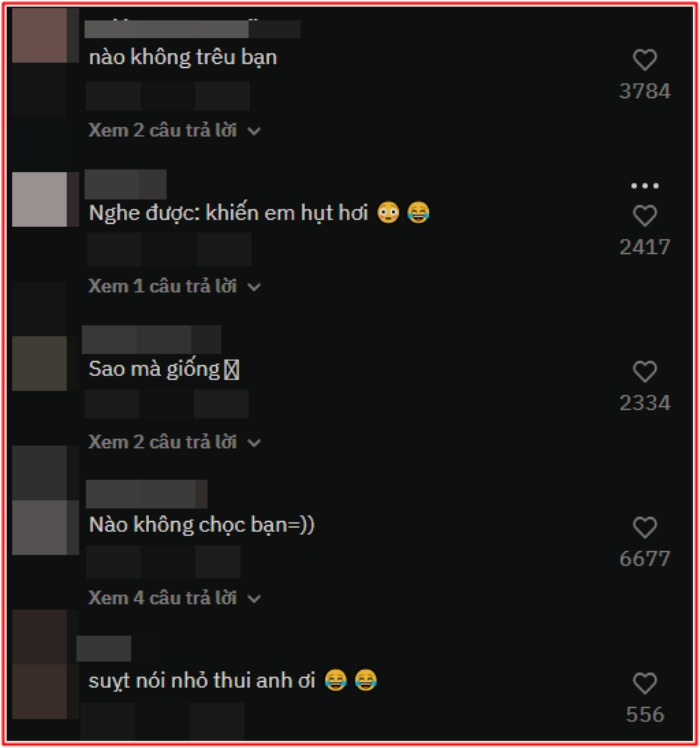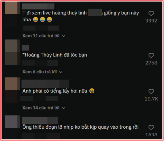 Dưới đoạn clip, hàng nghìn tài khoản cư dân mạng đã tham gia bình luận về màn cà khịa hài hước này. Đa số ý kiến đều khen ngợi sự hài hước trong đoạn clip cover này cũng như tranh thủ "cà khịa" Hoàng Thùy Linh. Đáng nói, những bình luận dưới đoạn clip này nhận về hàng nghìn lượt yêu thích, cho thấy chủ đề về Hoàng Thùy Linh hát live vẫn rất được quan tâm.