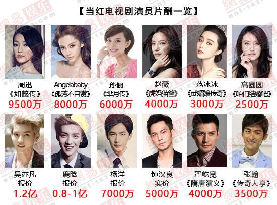 Xếp sau cô là Angelababy với 80 triệu NDT (hơn 12 triệu USD). Tôn Lệ với Mị Nguyệt truyện được trả 60 triệu NDT (khoảng 9 triệu USD). Những vị trí tiếp theo thuộc về Triệu Vy (6 triệu USD), Phạm Băng Băng (4,55 triệu NDT).
