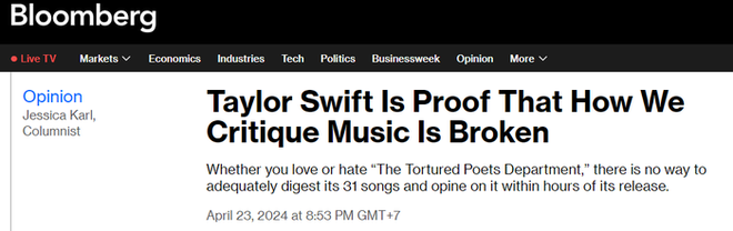 Tạp chí Bloomberg mới đây đã xuất bản một bài viết bảo vệ Taylor Swift trước làn sóng chỉ trích vô lý từ các trang view về album The Tortured Poets Department: "Cho dù mấy người có yêu hay ghét Taylor Swift đi chăng nữa, thì mấy người cũng không thể nào hiểu hết đầy đủ về 31 ca khúc và viết xong bài review chỉ sau vài giờ phát hành album".