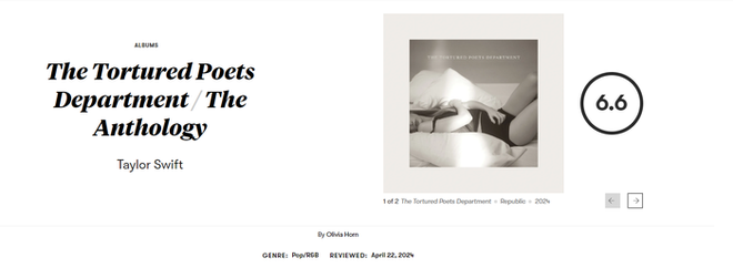 Chưa đầy 1 tuần kể từ thời điểm ra mắt của “siêu album" The Tortured Poets Department vào 19/4, các tạp chí đã liên tục đăng tải review cùng điểm số cho album thứ 11 của Taylor Swift. Thẳng thắn mà nói, The Tortured Poets Department tạo nên làn sóng phân cực rõ ràng: người sẽ rất thích với số điểm tuyệt đối và sẽ có những bên lại chấm điểm rất thấp. Bỏ qua những thành tích cao chót vót thì không khó để thấy album lần này của Taylor Swift tạo nên vô vàn ý kiến trái chiều nơi giới phê bình. Đặc biệt, có trang tạp chí còn thẳng thắn cho biết do sợ bị những “fan cuồng" này sát hại nên bài review của họ sẽ không để tên tác giả.