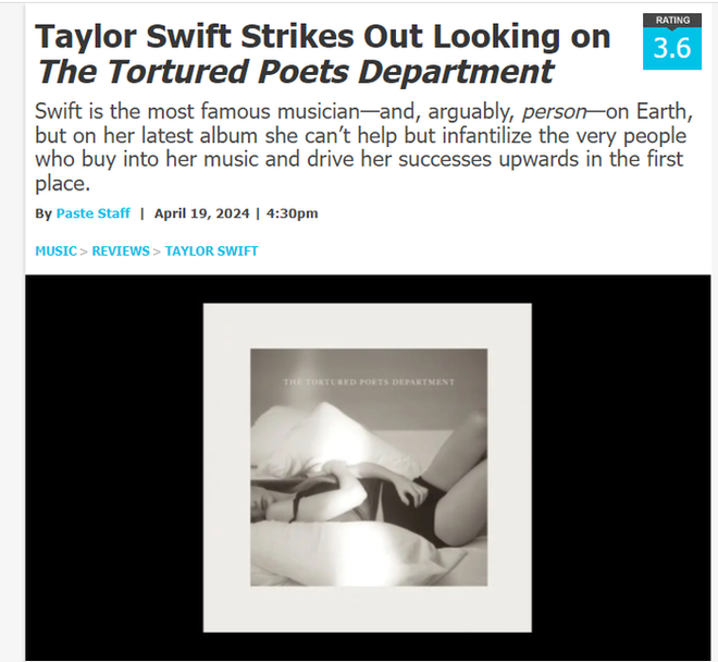 Cụ thể, Tạp chí Paste nổi tiếng với nhiều review về các sản phẩm của nghệ sĩ vừa qua cũng đăng tải nhận xét, trong đó, cho rằng Taylor Swift - với vai trò là nhạc sĩ nổi tiếng nhất thế giới nhưng trong The Tortured Poets Department lại không thể khiến fan của cô ấy bớt “trẻ con" - điều cũng góp phần vào sự thành công của cô.