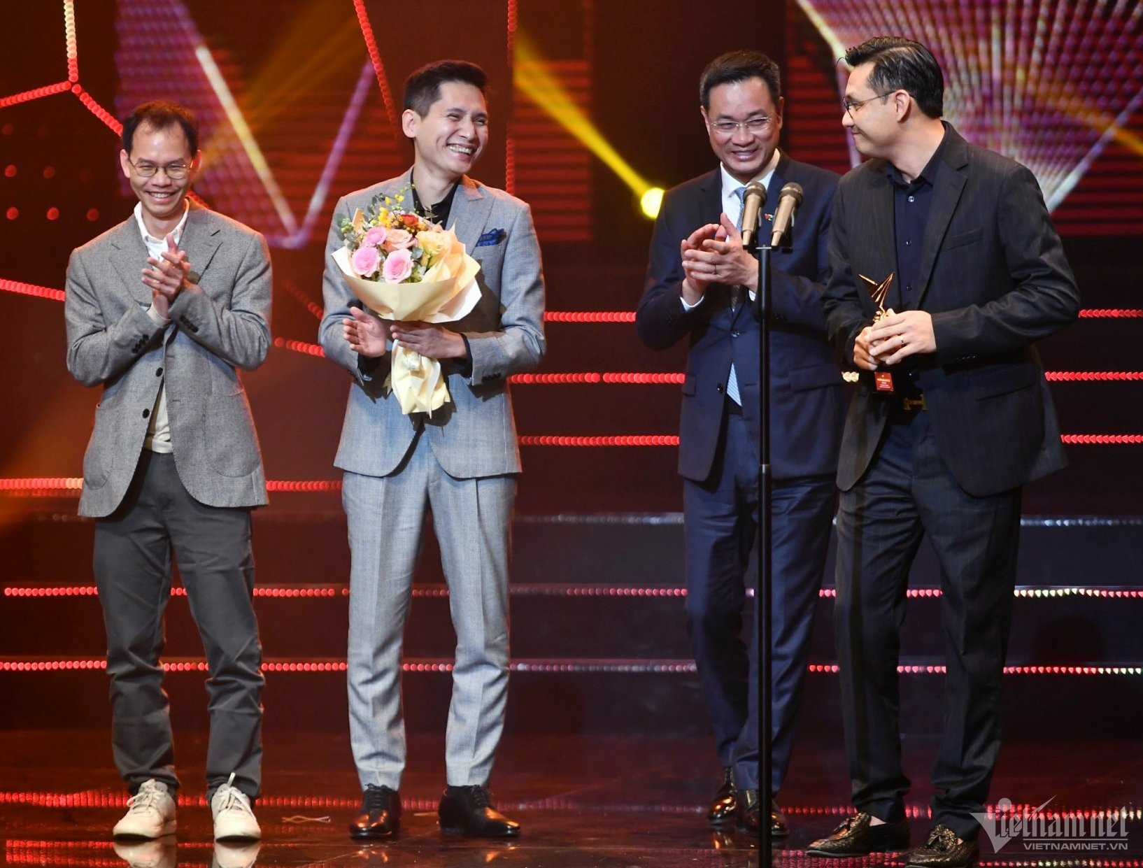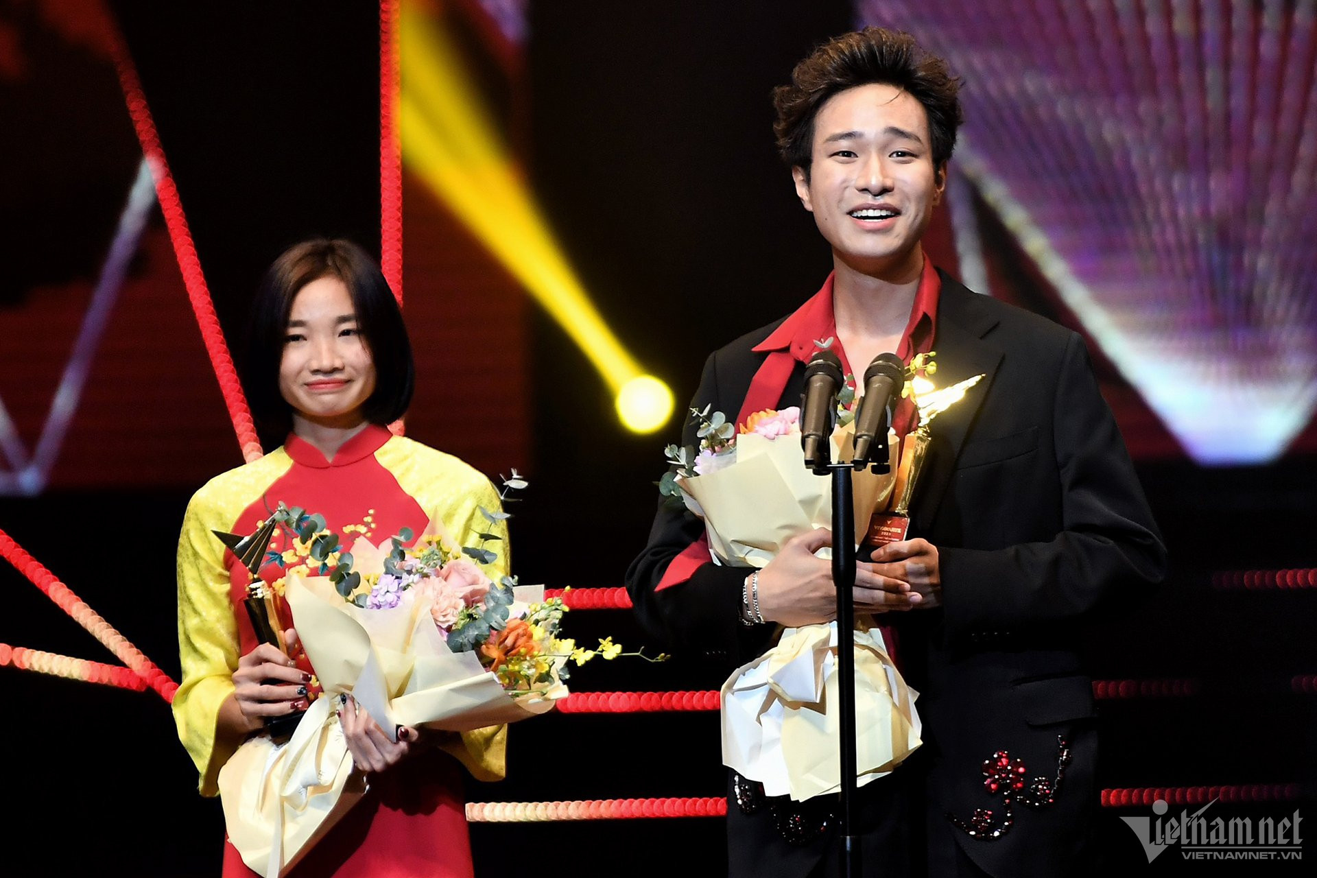 Ông Nguyễn Thanh Lâm - Thứ trưởng Bộ thông tin và Truyền thông trao giải hạng mục Gương mặt trẻ ấn tượng cho 3 cá nhân: VĐV Nguyễn Thị Oanh, ca sĩ Hà An Huy, đạo diễn Phạm Thiên Ân.