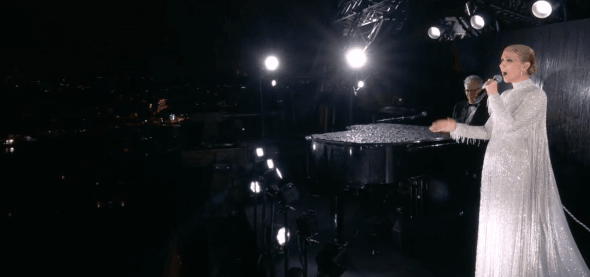 Celine Dion xuất hiện lộng lẫy như một nữ thần ngay giữa ngọn tháp Eiffel - biểu tượng của Paris. Diva người Canada cất cao giọng hát với L'hymne À L'amour, bản tình ca kinh điển từng gắn liền với huyền thoại nhạc Pháp Édith Piaf. Đây cũng chính là sân khấu tái xuất xứng tầm với Celine Dion sau nhiều năm chống chọi với căn bệnh hiểm nghèo.