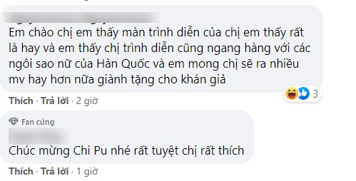 Tuy nhiên bên cạnh đó cũng có nhiều ý kiến cho rằng sân khấu biểu diễn của cô không thua kém gì các nghệ sĩ nước ngoài. Đồng thời với những nỗ lực của Chi Pu trong ngần ấy năm thì cô xứng đáng nhận được những lời khen thay vì cứ mãi chê bai.