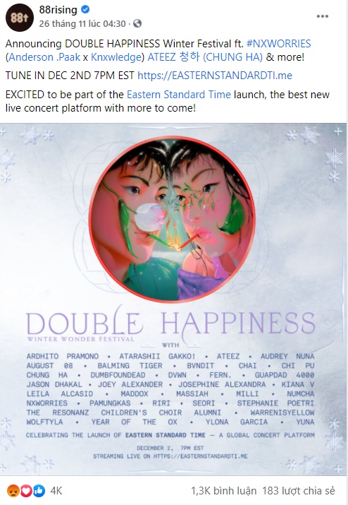 Double Happiness được tổ chức online vào ngày 3/12, kéo dài suốt 8 tiếng bắt đầu từ 7 giờ sáng. Music event có sự góp mặt của nhiều nghệ sĩ trẻ đến từ khắp các quốc gia trên thế giới như Mỹ, Nhật Bản, Indonesia, Malaysia, Hàn Quốc và Việt Nam.