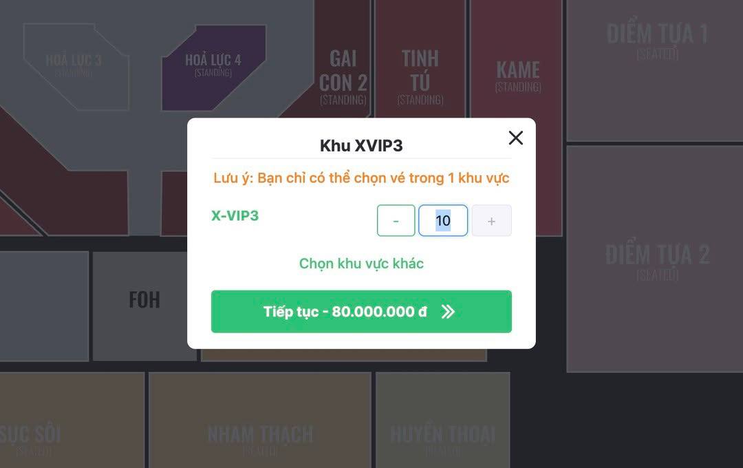 Concert "Anh Trai Vượt Ngàn Chông Gai" có tổng cộng 12 hạng vé khác nhau, từ 800 nghìn đến 8 triệu đồng. Trong đó, khu vực XVIP có giá cao nhất là 80 triệu đồng cho một phòng chứa tối đa 10 người, tương đương 8 triệu đồng/vé. Đây không chỉ là một chỗ ngồi thông thường mà là một lounge riêng biệt, được thiết kế để mang lại trải nghiệm thoải mái và tiện nghi cho những fan cuồng nhiệt.