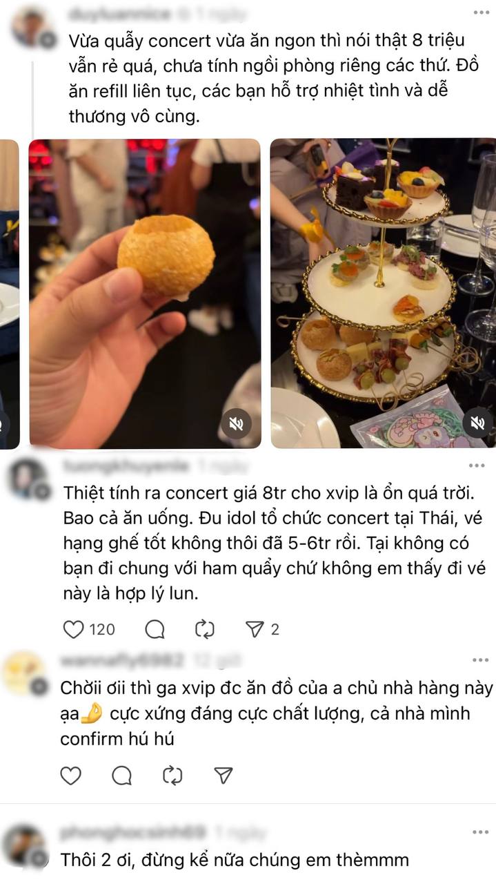 Những fan “gai con” đã có cơ hội trải nghiệm khu vực XVIP không tiếc lời khen ngơi chất lượng của chỗ ngồi này. Không chỉ có đồ ăn ngon, không gian rộng rãi thoải mái mà còn được phục vụ tận tình, đặc biệt là cảm giác “sáng chảnh” khi được riêng tư trong phòng lounge. Tuy nhiên, cũng có người đánh giá rằng nếu ngồi ở khu vực này thì bạn nên chuẩn bị một chiếc điện thoại có camera zoom khủng, vì vị trí hơi xa sân khấu một chút phù hợp với những team thích vừa quẩy vừa chill.