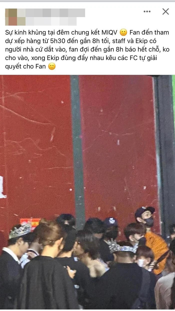 "Sự kinh khủng tại đêm chung kết Miss International Queen Vietnam. Fan đến tham dự xếp hàng từ 5h30 đến gần 8h tối, ban tổ chức và ê-kíp có người nhà cứ dắt vào, fan đợi đến gần 8h báo hết chỗ, không cho vào, xong ê-kíp đùng đẩy nhau kêu các FC tự giải quyết cho fan", một tài khoản Facebook chia sẻ.