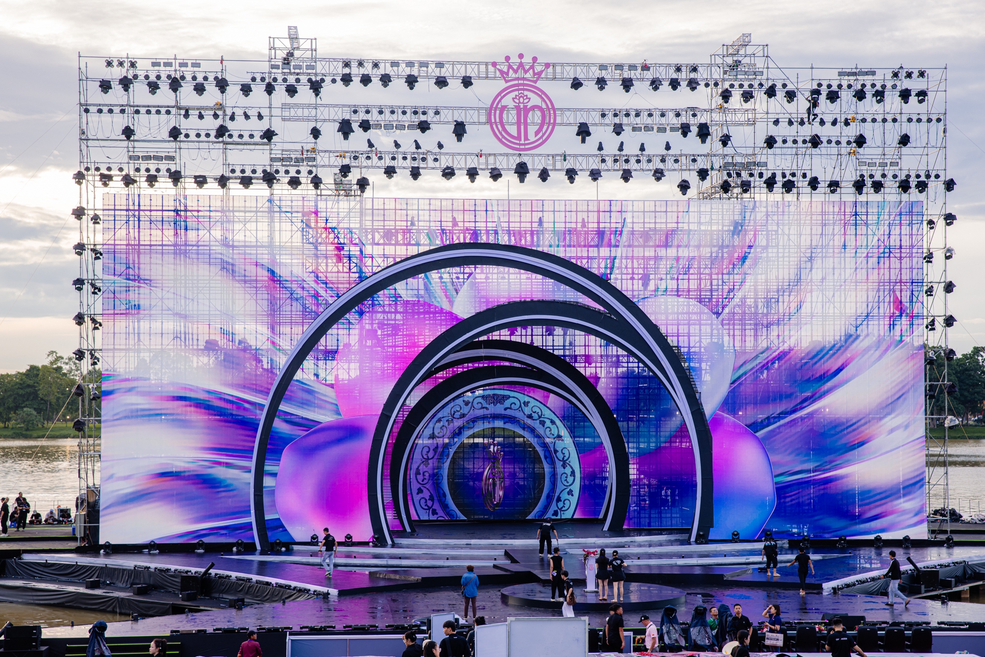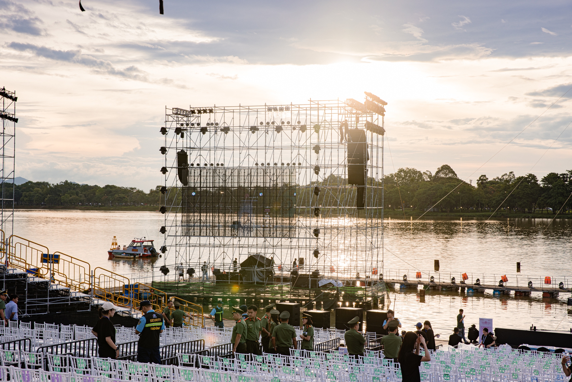 Sân khấu năm nay được đầu tư công phu, hoành tráng và mang đậm dấu ấn văn hóa khi được dàn dựng ngay trên mặt nước sông Hương. Không gian ngoài trời thoáng đãng, kết hợp với thiết kế ánh sáng hiện đại cùng hiệu ứng trình chiếu đặc biệt hứa hẹn mang đến cho khán giả một đêm chung kết mãn nhãn. Ngay từ chiều 27/6, khu vực tổ chức đã sôi động hơn bao giờ hết khi công tác chuẩn bị gần như hoàn tất, hàng trăm nhân sự hậu trường tất bật với những phần việc cuối cùng trước giờ lên sóng trực tiếp.