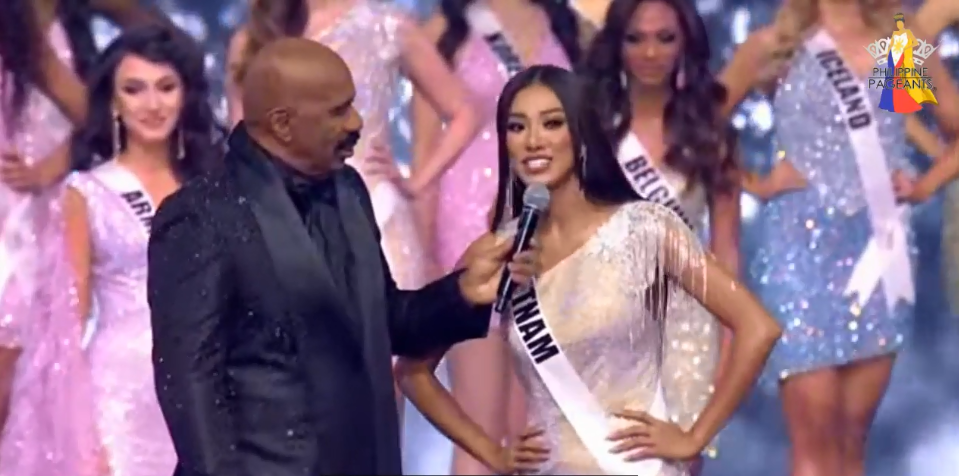 Steve Harvey xuất hiện trên sân khấu. Anh là một trong những MC đắt show nhất thế giới. Đây là lần thứ 6 nam MC này đảm nhận vai trò dẫn dắt tại Miss Universe.